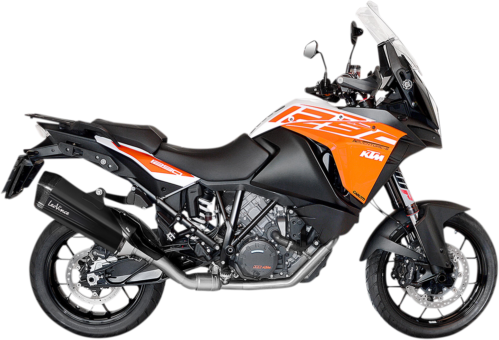 AISI 304 Stainless Steel Black ceramic-based painting Full carbon end cap with matte clear coating Dual flow muffler TIG welds Laser-etched "LeoVince" logo Laser cut bracket Fits with rails for original and Givi panniers