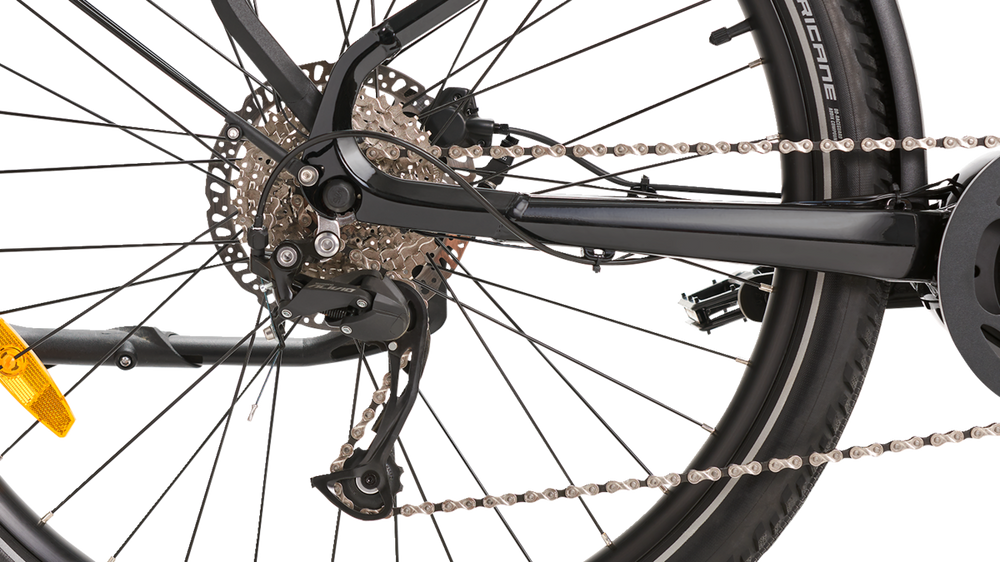 - Front LED light XC-259A (powered by main battery), Rear LED SPANNINGA LED Commuter Glow XE with brake light Integrated into rear rack (powered by main battery), Front & Rear Fenders, Rear Cargo Rack Accessory ready, Integrated Chainring Guard, Water Bottle Bosses on Seat Tube, Kickstand, Alloy MTB Pedals, Bell, Tool Kit, Battery Charger