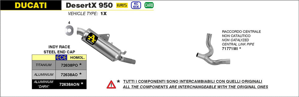 IN STOCK Arrow Indy Race Slip-on Exhaust, Aluminum for Ducati DesertX 950 2022-2024 72638AO