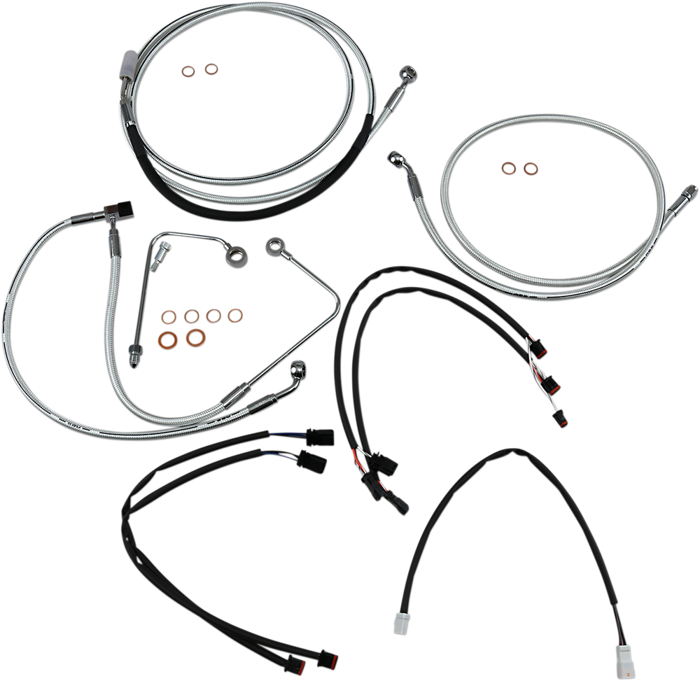 - Kit includes throttle and idle cables of throttle-by-wire extensions, clutch cable or hydraulic clutch line, brake lines, copper crush washers, hardware, and any necessary switch wiring of turn signal extension