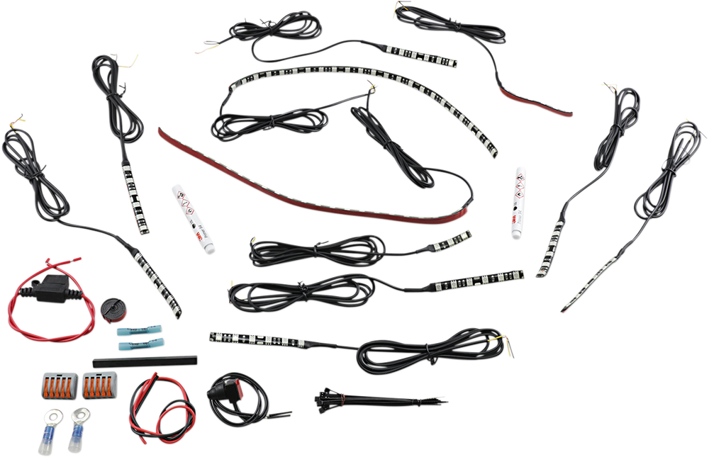- Includes 8 MagicFlex2® 6 LED strips (3" length) for mounting to the frame under the seat, back of the air cleaner, on upper part of frame at the front of the gas tank, and on the lower frame on each side of the oil cooler