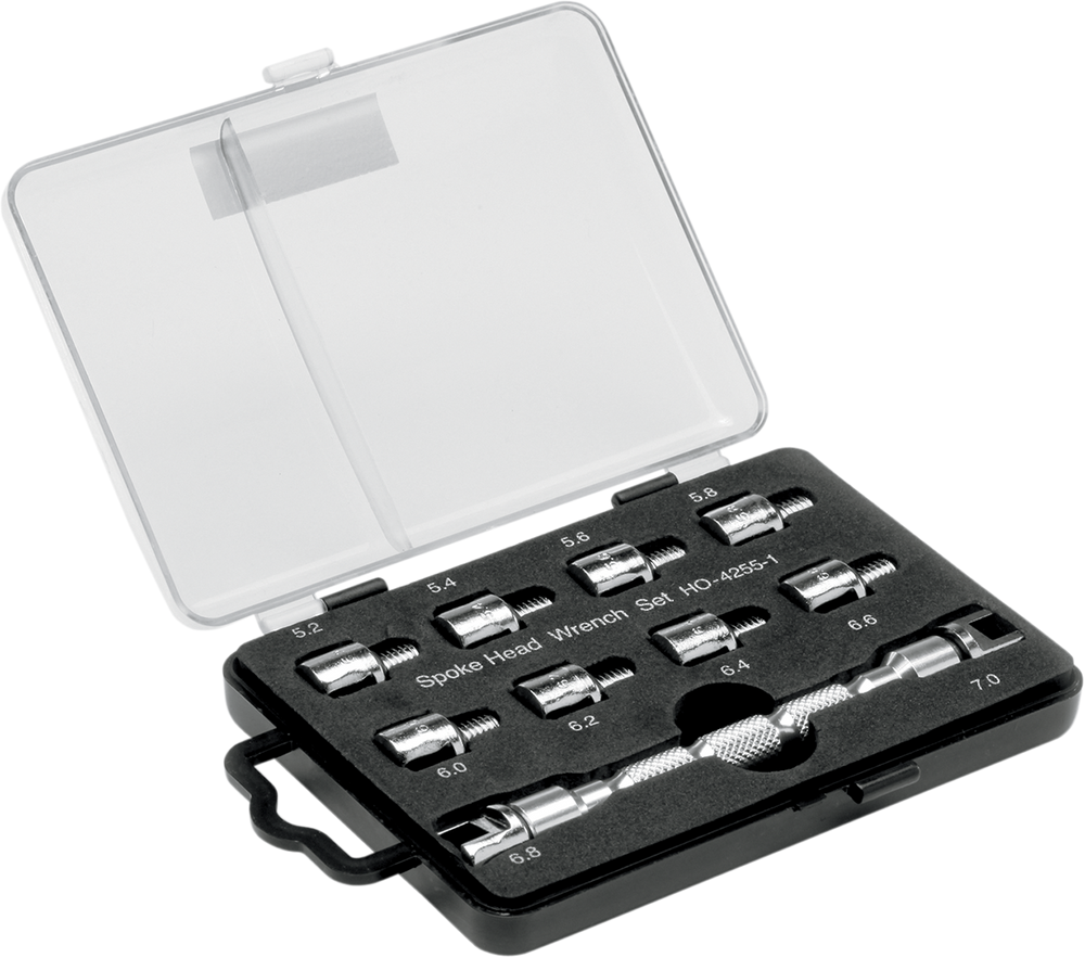 - Spoke wrench kit includes all popular sizes (5.2 mm - 7 mm) with handle and storage case