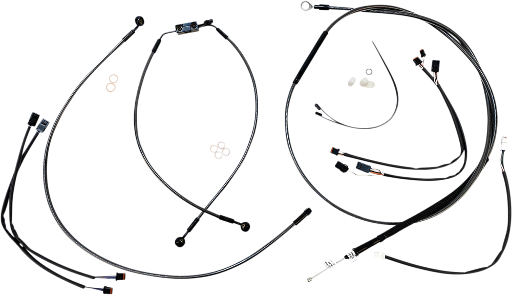 - Kit includes throttle and idle cables of throttle-by-wire extensions, clutch cable or hydraulic clutch line, brake lines, copper crush washers, hardware, and any necessary switch wiring of turn signal extension