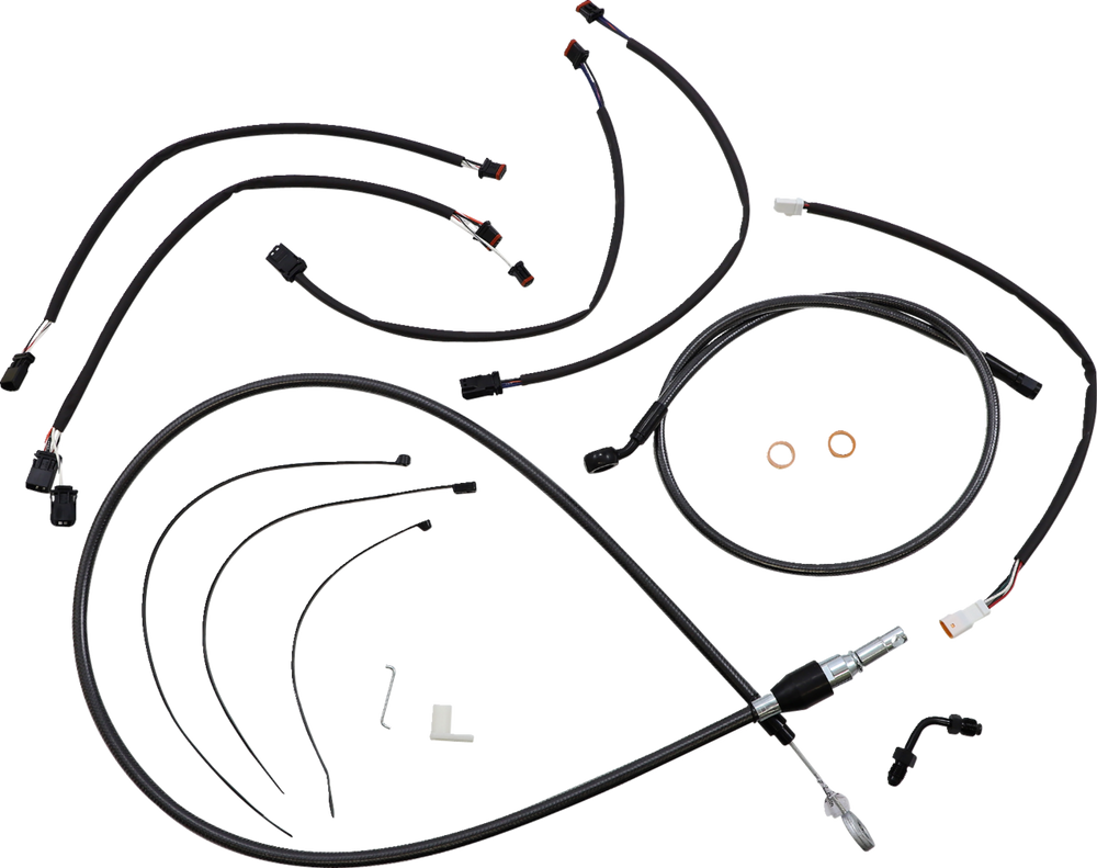 - Kit includes throttle and idle cables of throttle-by-wire extensions, clutch cable or hydraulic clutch line, brake lines, copper crush washers, hardware, and any necessary switch wiring of turn signal extension