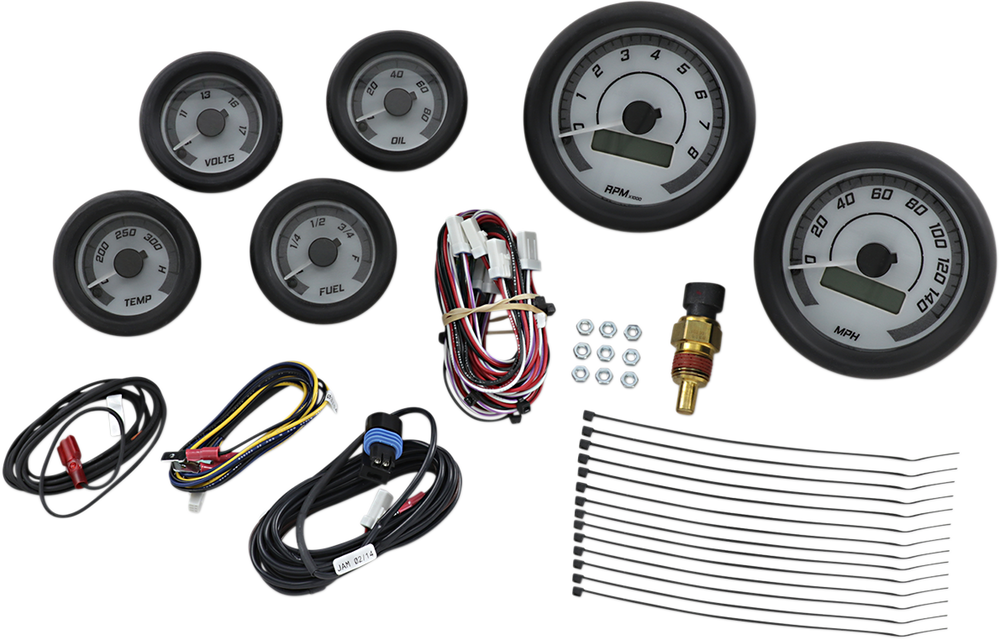 - Six-gauge kits include speedometer, tachometer, oil pressure, oil temperature, fuel level, and voltmeter