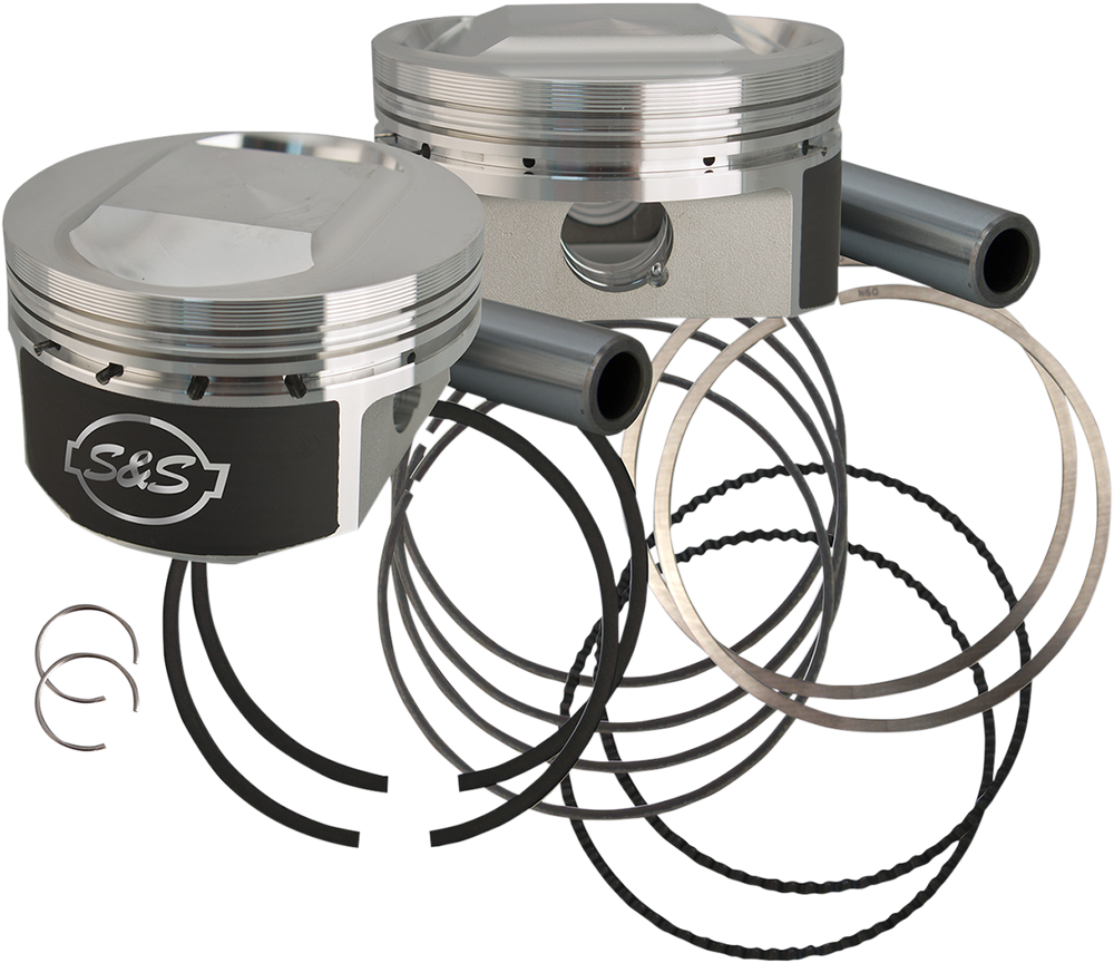 Piston Kits include forged pistons, rings, wrist pins, and clips for a complete motor Flat-Topped Replacement Piston Kits For '84-'99 HDÂź Big Twins with Stock Heads or S&S Performance Replacement Heads