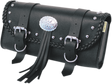 - Black synthetic leather, braided edges, studs, conchos and fringe