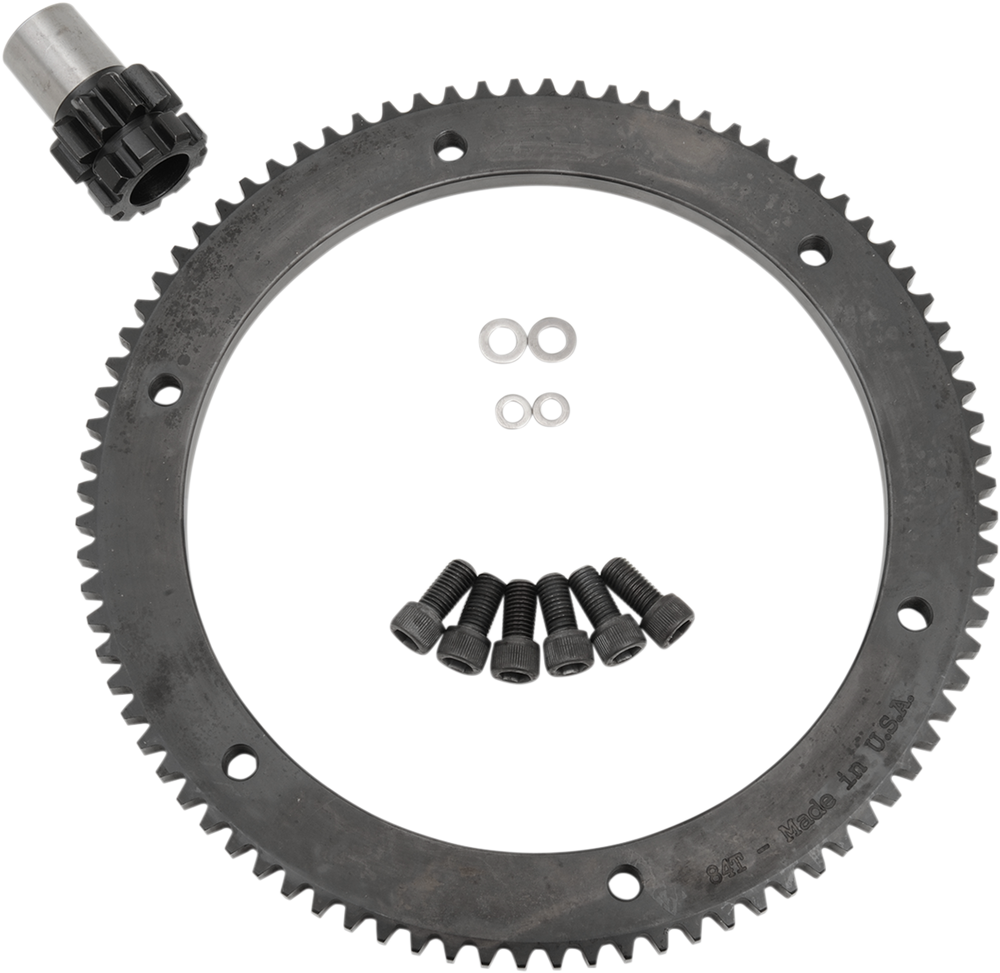 - Features a 10-tooth pinion gear and an 84-tooth starter ring gear that produces 15% more starting torque than stock (9:66 ratio) gears
